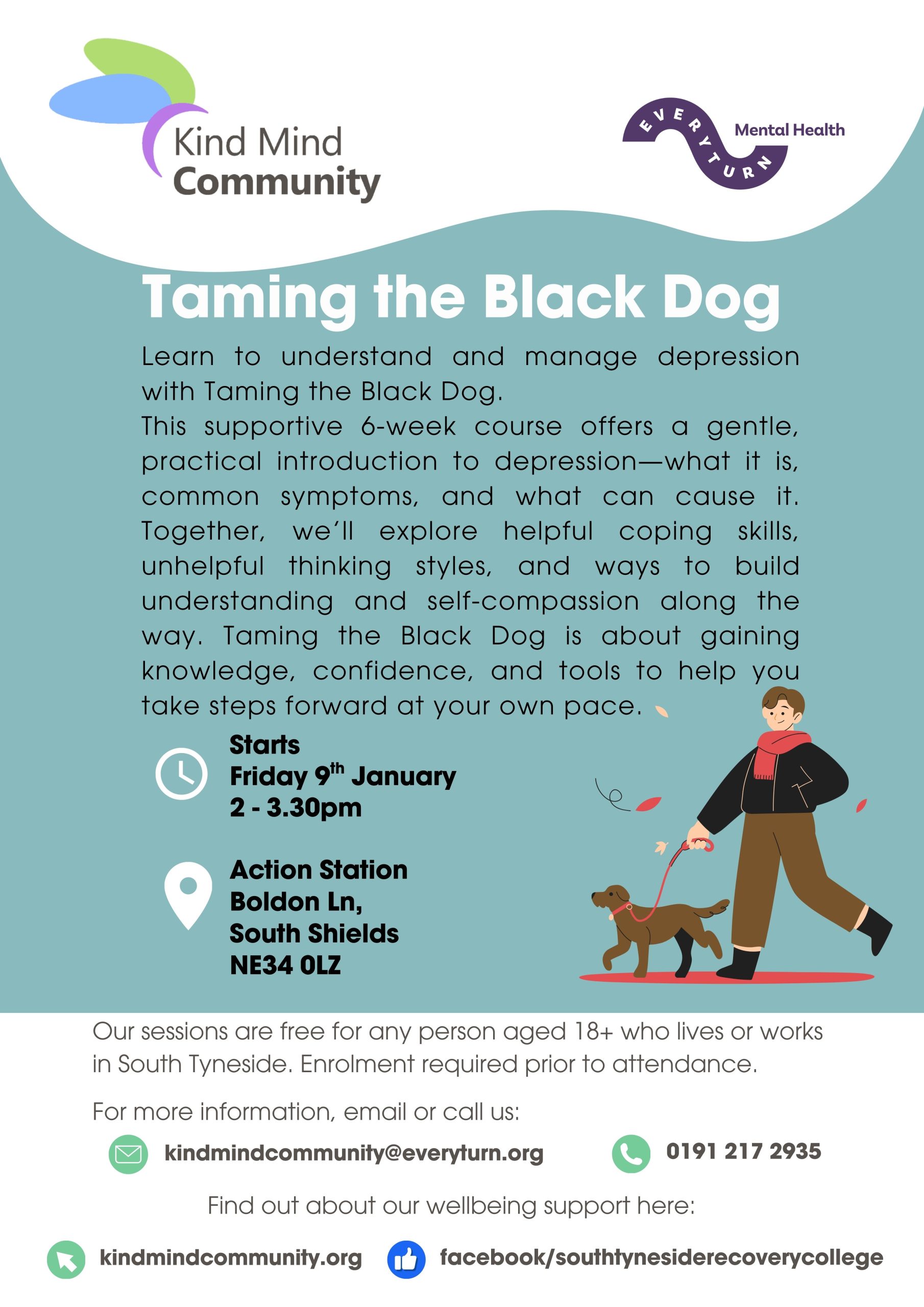 This supportive 6-week course offers a gentle, practical introduction to depression—what it is, common symptoms, and what can cause it. Together, we’ll explore helpful coping skills, unhelpful thinking styles, and ways to build understanding and self-compassion along the way. Taming the Black Dog is about gaining knowledge, confidence, and tools to help you take steps forward at your own pace.” The course starts Friday 9th January, 2:00pm - 3:30 pm at Action Station, Boldon Lane, South Shields, NE34 0LZ. Sessions are free for people aged 18+ who live or work in South Tyneside, with enrolment required before attending. Contact details: kindmindcommunity@everyturn.org , phone 0191 217 2935, website kindmindcommunity.org, and Facebook page South Tyneside Recovery College. Logos for Kind Mind Community and Everyturn Mental Health appear at the top.